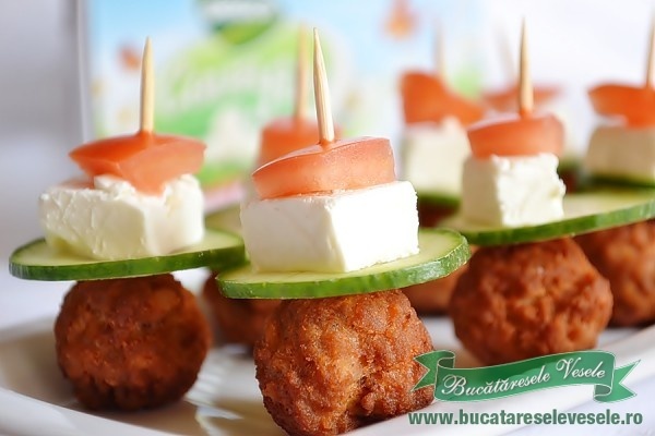 Carnea tocata se amesteca cu cele doua oua, cu ghimbirul ras, cu patrunjelul taiat marunt, cu usturoiul si apoi se condimenteaza cu sare si piper dupa gust. Din compozitia rezultata se formeaza chiftelute mici care apoi se aseaza intr-o tava tapetata cu hartie de copt si se prajesc fara ulei in cuptorul preincalzit circa 10-15 minute. Din timp in timp se intorc chiftelutele pentru a se coace uniform. Cine doreste sa le prajeasca mai repede poate sa aleaga varinata mai rapida prajindu-le in ulei. Infingem in fiecare chifteluta cate o scobitoare pe care tragem apoi o felie de castravete proaspat, o bucatica de crema de branza cu smantana- Ceva fin de la Delaco si deasupra punem si o bucatica de rosie.