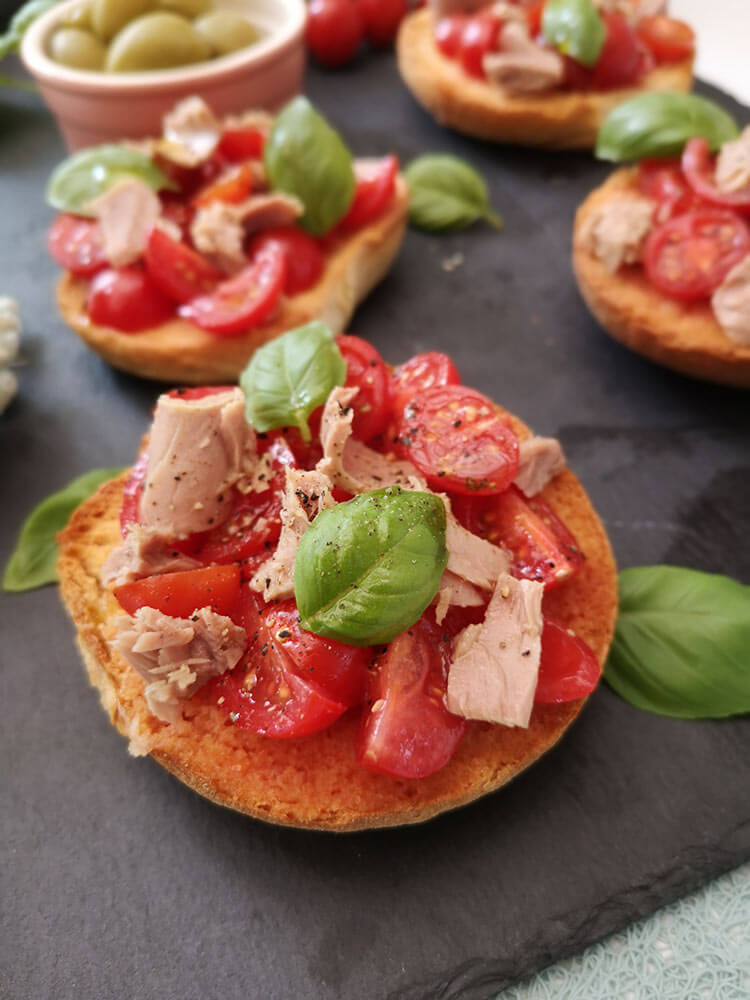 5. Aceste friselle cu rosii si ton e servesc împreună cu măsline verzi.