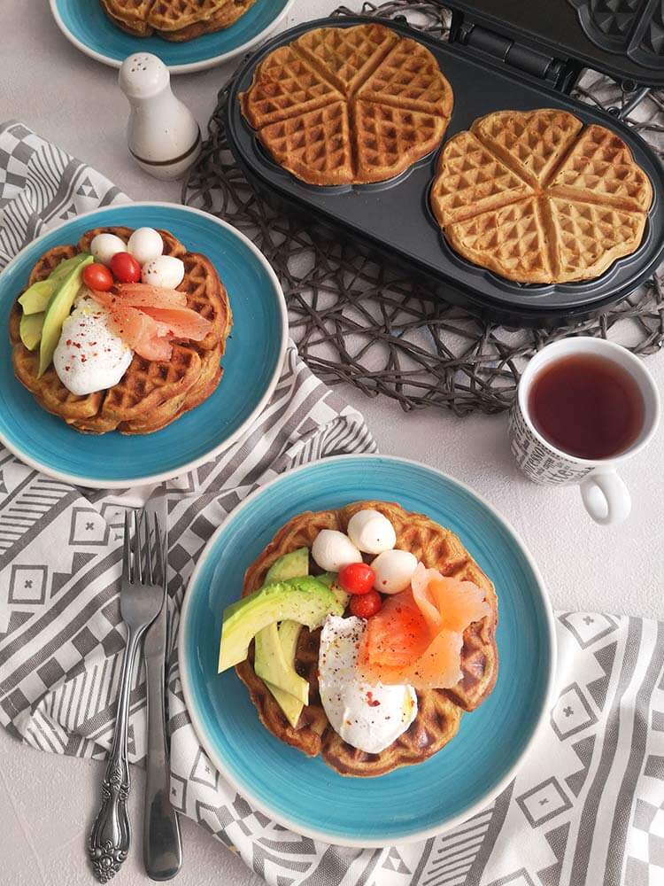 Compozitia o puteti pregati de cu seara, sta foarte bine la frigider, iar dimineata nu trebuie decat sa le coaceti in aparatul de gofre. Toppingul este la alegerea voastra, poate contine, creme de branza, ou ochi, ou posat, avocado, somon afumat, prosciutto, sau orice va place voua.