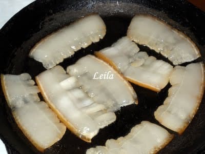 Feliile de slaninuta le crestam si le punem in tigaie la prajit. Cand sunt prajite si au lasat untura suficienta le scoatem deoparte. Adaugam la calit ceapa taiata solzisori in tigaia cu untura.