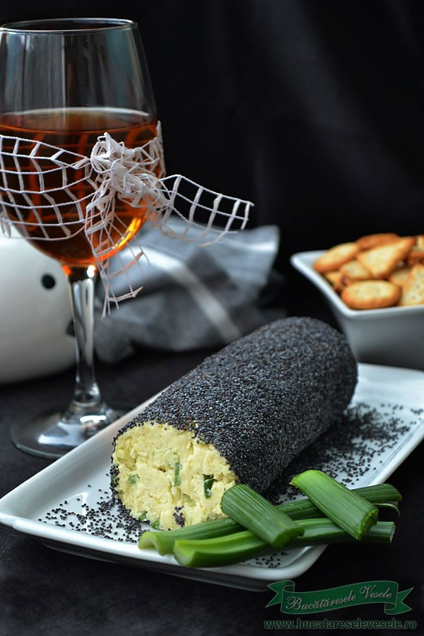 Rulada aperitiv cu branza si cascaval, se poate servi cu biscuiti sarati, cu coji de ceapa verde, cu rididichi, cu fructe deshidratate, dar si cu fructe proaspete, cirese, smochine, … .
