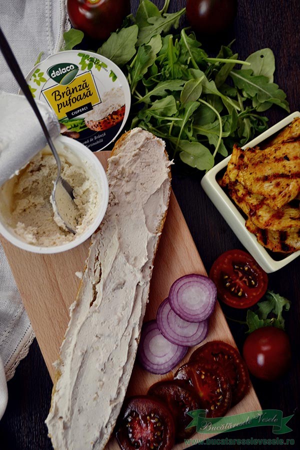 Pieptul de pui feliat, se condimenteaza cu sare, piper, boia dulce si putin ulei de masline, apoi se prajeste la gratar. Se taie bagheta pe din doua, pe lung, ungem generos ambele bucati cu branza pufoasa cu ciuperci, asezam pe una din ele rucola, felii de rosii, piept de pui si rondele de ceapa rosie.