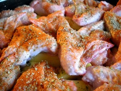 Aripioarele le condimentam cu sare , piper ,boia dulce si maghiran . Cartofii ii curatam , spalam si ii taiem in patru . Asezam intr-un vas termorezistent sau ceramica untura topita (sau uleiul) ,deasupra asezam cartofii pe care ii condimentam cu delikat si deasupra asezam aripioarele . Turnam deasupra supa de carne si vinul , acoperim vasul si il dam la cuptorul preincalzit . Il tinem circa 35 minute la cuptor dupa care indepartam capacul si lasam sa se rumeneasca aripioarele.