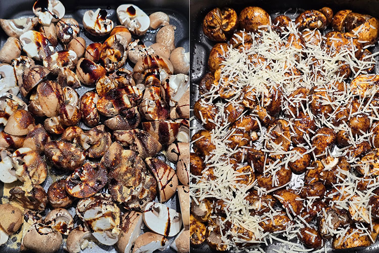 In cosul de jos puneti ciupercile taiate. Stropiti cu 1-2 linguri ulei, cu sos de soia, presarati deasupra parmezan razuit si amestecati. Setati ambele cosuri la 200 grade Celsius.