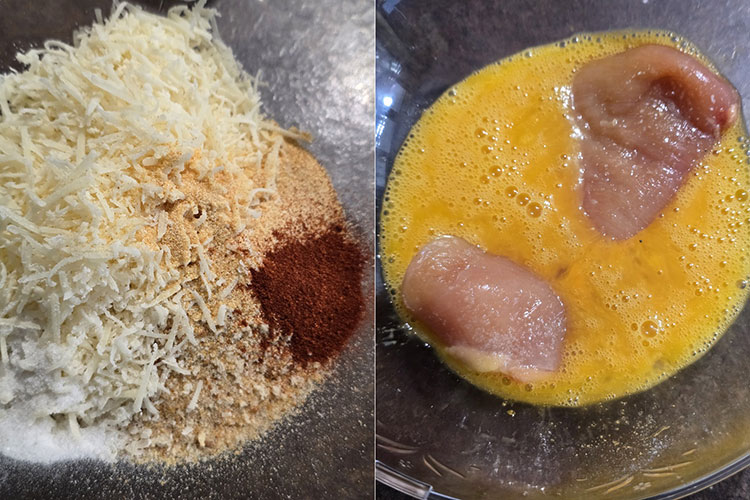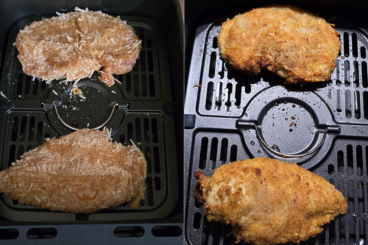 Preincalziti friteuza la 200 grade Celsius. Bucatile de carne condimentate se dau prin ou apoi prin amestecul de pesmet si parmezan. Puneti bucatile de carne pe gratarul din cosul friteuzei si pulverizati deasupra putin ulei.