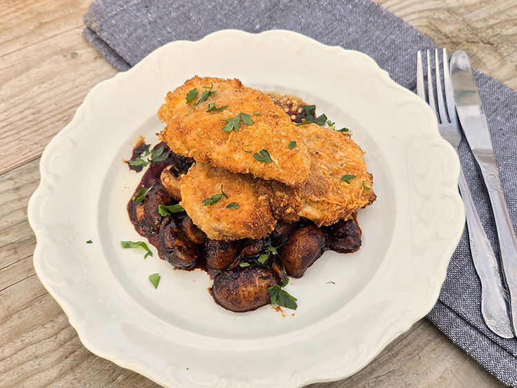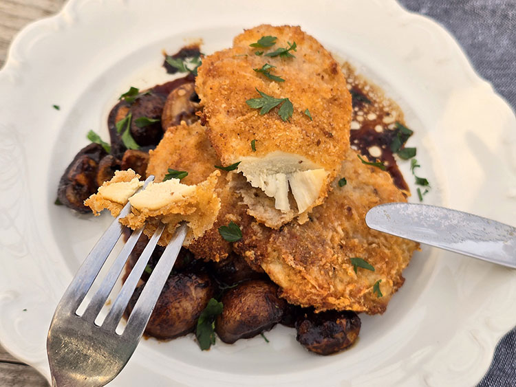 La semnalul sonor friptura si garnitura sunt gata pentru a fi servite. Am obtinut un piept de pui crocant la exterior si suculent la interior, iar garnitura de ciuperci a fost delicioasa.