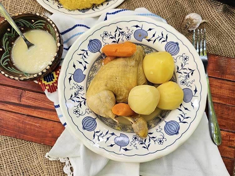 Se pune pe farfurie o bucata de carne, cativa morcovi, 2-3 cartofi si putina zeama. Se mananca cu mamaliga calda si mujdei de usturoi.