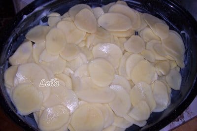 Carnea o batem sa o subtiem (nu trebuie sa fie exagerat de subtiri cam cat latul lamei de cutit) si o condimentam cu sare din abundenta. Cartofii se vor curata si felia rondele mai subtiri . Ardeii , rosiile le taiem rondele asemeni.Cele 500 ml smantana il vom subtia cu 400 ml lapte si vom pune sare dupa gust in acest amestec.