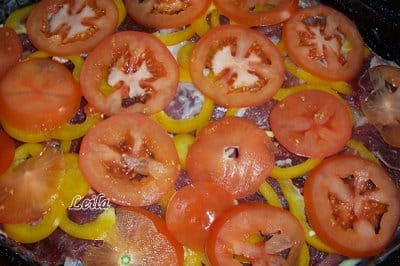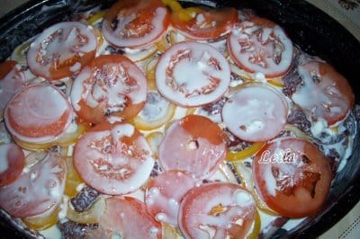 O tava mai adanca o ungem din abundenta cu untura sau daca nu aveti puteti folosi si untul . Asezam in tava unsa jumatate in cartofii feliati peste ei asezam feliile de carne condimentate cu sare . Peste carnea frumos aranjata asezam feliile de ardei si rosii. Acum ca am impodobit asa frumos tava turnam peste jumatate din smantana subtiata cu lapte. Acoperim totul cu cealalta parte de cartofi , si turnam peste ei si restul ramas de smantana subtiata.