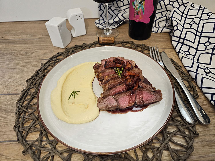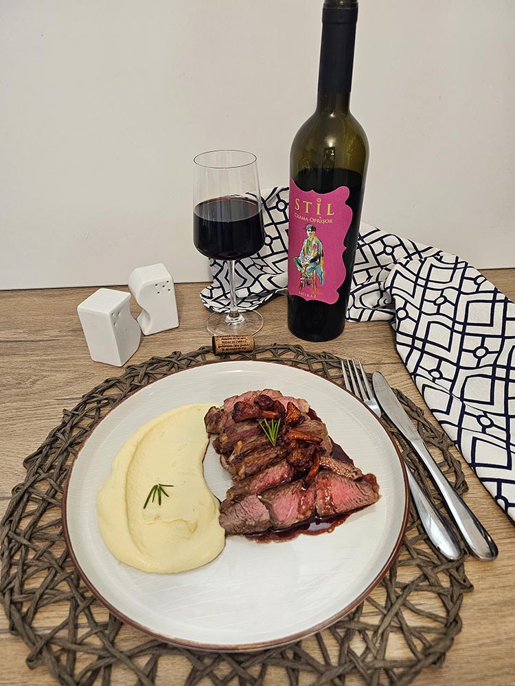 Asa cum v-am spus in introducere, vinul STIL- Shiraz de la Crama Oprisor este alegerea perfecta pentru a incheia o cina si o seara minunata. Shiraz-ul este faimos pentru notele sale de piper negru, ciocolata si fructe de padure si se impleteste perfect cu crusta rumena a antricotulu, sosul si piureul catifelat. Recomand sa fie servit la o temperatura de 17-18°C, este o temperatura ideala indiferent de anotimp.