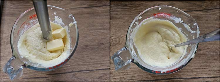 Se paseaza pana devine o pasta, se adauga si untul si se omogenizeaza tot cu pasatorul. In acest moment se definitiveaza gustul cu sare si se mai adauga din lichidul ramas dupa fierbere cat sa aiba o textura cremoasa.
