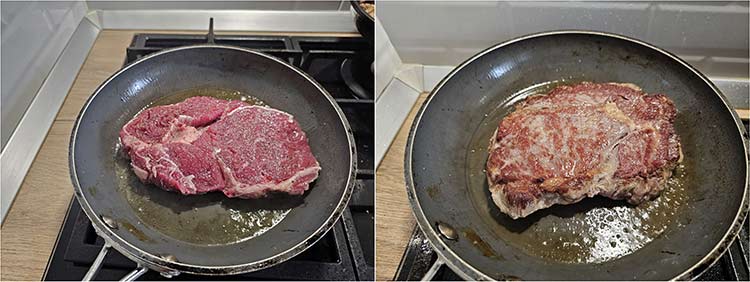 Se pune o tigaie la incins, se adauga 1-2 linguri de ulei de masline sau din samburi de struguri apoi se pune felia de antricot. Se apasa usor carnea cu o spatula cat sa adere pe toata suprafata tigaii. Se lasa la prajit pe o parte cam 3-4 min pana ce capata o crusta aurie. Se intoarce si se mai lasa la prajit cam 1-2 min.