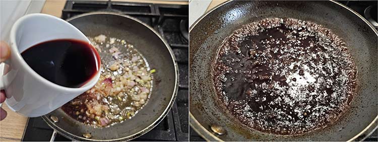 Se scot ciupercile si in grasimea ramasa se adauga ceapa tocata marunt si se caleste pret de 1 min, apoi se adauga vinul si zaharul/mierea. Se lasa sa fiarba si sa scada la jumatate pana ce lichidul devine siropos si imbraca lingura.