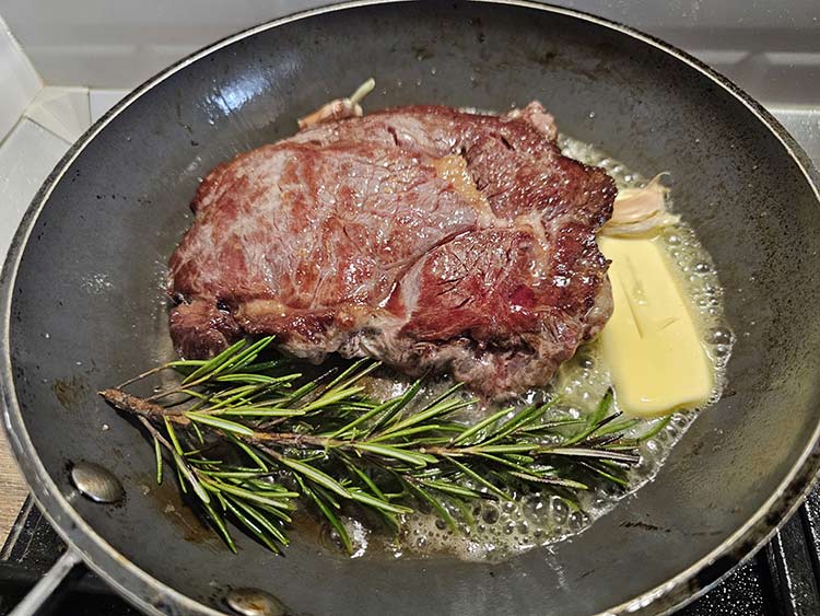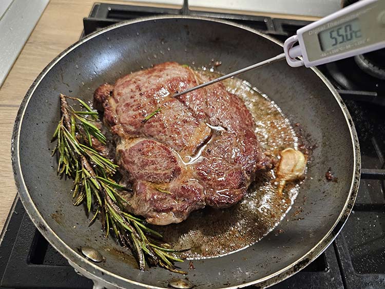 Cu ajutorul unei linguri se stropeste antricotul cu untul incins din tigaie timp de 1 min.. Tot in acest moment se infinge in carne un termometru de carne si se verifica temperatura interioara. Este gata cand temperatura ajunge la 55°C , carnea este medium-rare, asta inseamna ca o sa ramana rozalie in interior atat cat trebuie.