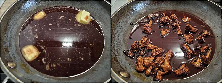 Se adauga apoi in tigaie untul, cateii de usturoi usor zdrobiti si crenguta de rozmarin.