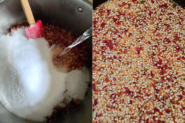 Punem ardeii si usturoiul maruntiti intr-un vas mai mare la care adaugam zaharul, otetul, apa si sarea. Lasam sa fiarba maxim 5 minute de la primul clocot.
