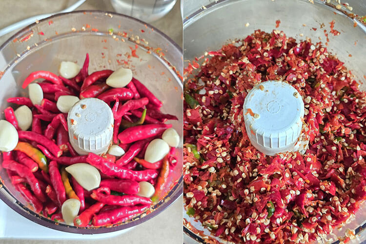 Se pun intr-un robot de bucatarie impreuna cu cateii de usturoi curatati, spalati si scursi de apa si se maruntesc.