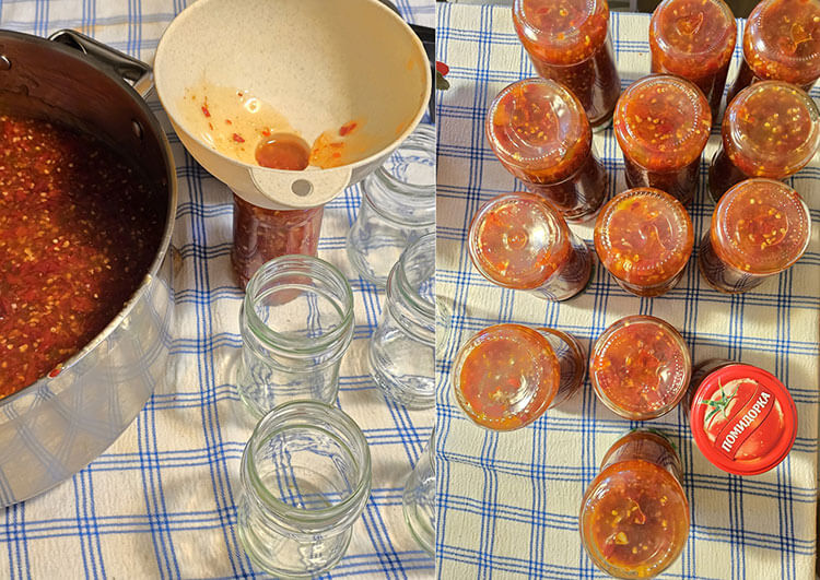 Sosul astfel obtinut se pune in borcanele spalate si scurse, punem capacele si le punem in cuptorul rece.