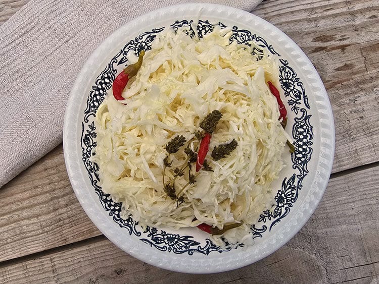 Peste punem varza taiata si printre punem ardei iuti sau piper boabe. Peste varza asezata in galetusa sau borcan punem o felie de paine pe care o legam in tifon.
