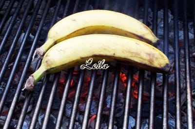 Spalam bananele, si le stergem cu un prosop uscat. Le asezam pe gratar si le prajim pana coaja devine maronie.