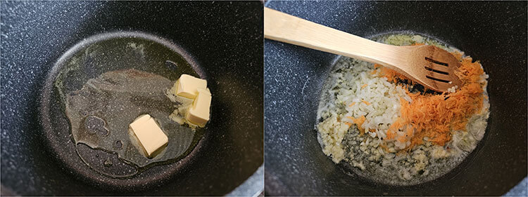 Intr-o cratita incapatoare cu peretii grosi se pune untul si uleiul, se adauga ceapa, morcovul, usturoiul, sare si piper si se soteaza pana legumele se inmoaie bine.