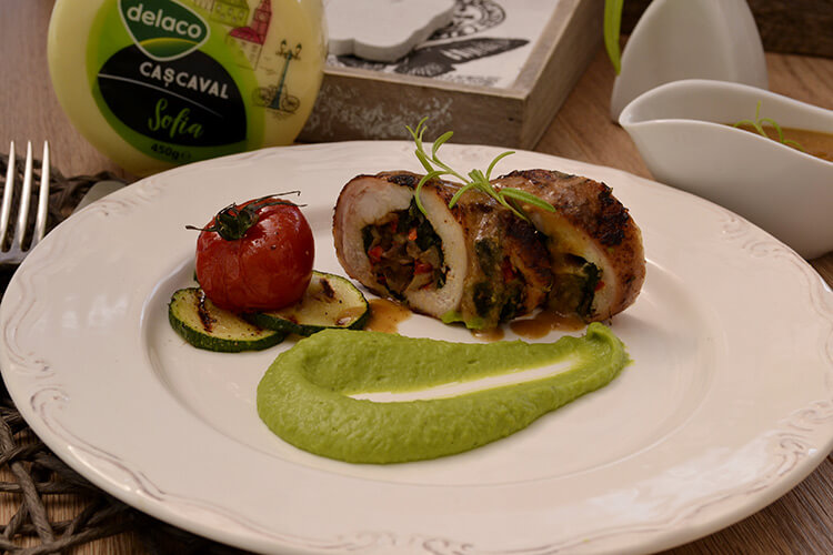Rulada se portioneaza in felii si se aseaza pe farfurie alaturi de piureul de mazare si sos.