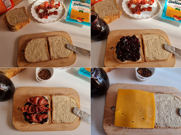Peste stratul de dulceata punem baconul prajit, presaram cu fulgi de ardei iute si acoperim cu 1-2 felii de branza Cedar peste care rasturnam cealalta felie de paine unsa in strat subtire. Presam putin cu mana si ungem felia de paine cu putin unt. Vedeti pasii si in imaginile de mai jos.