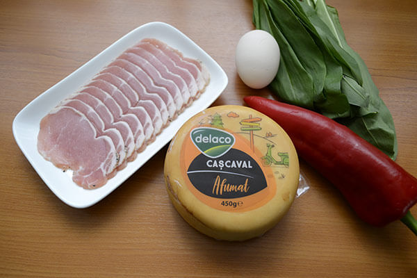 Se intinde fiecare bucata in parte ca in imagine, se aseaza la un capat umplutura formata din cascaval afumat, muschiulet, fasie de ardei capia si frunza de leurda.