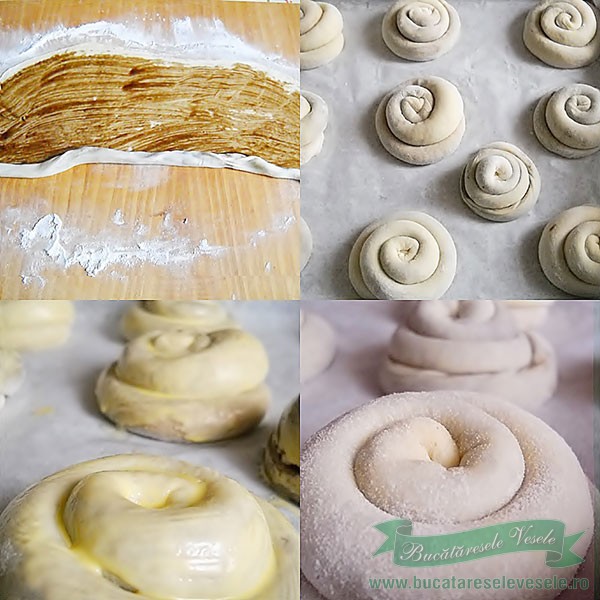 In acest timp aluatul a crescut. Fiecare bila se va intinde sub forma de dreptunghi avand o grosime de circa 2 mm (sa fie mai usor, de grosimea lamei unui cutit). Fiecare fasie de aluat intins se va unge cu compozitia de umplutura descrisa mai sus, apoi vom rula strans pe latura mai lunga obtinand astfel o bagheta. Incepem sa sucim bagheta obtinuta in forma de spirala si capatul ramas il vom aseza sub spirala formata. Asezam spiralele, melcii in tava tapetata cu hartie de copt si ii lasam la dospit 30 minute. In acest timp pornim cuptorul pentru a se incalzi. Fiecare melcisor, dupa ce a trecut timpul de dospire se va unge cu unt topit dupa care dam tava la cuptor pana melcii se vor rumenii frumos.