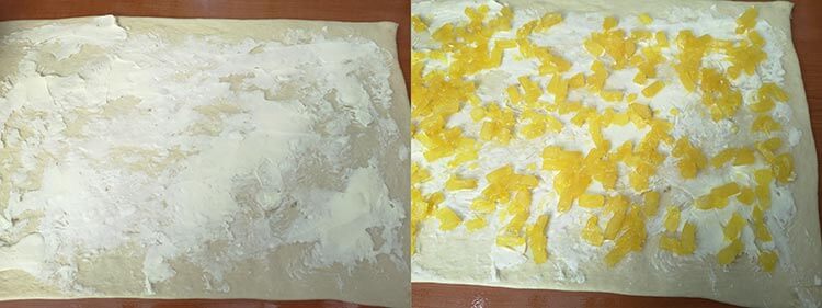 Aluatul dospit se intinde intr-o foaie dreptunghiulara , se unge toata suprafata cu unt peste care se pun bucatelele de ananas sotate.