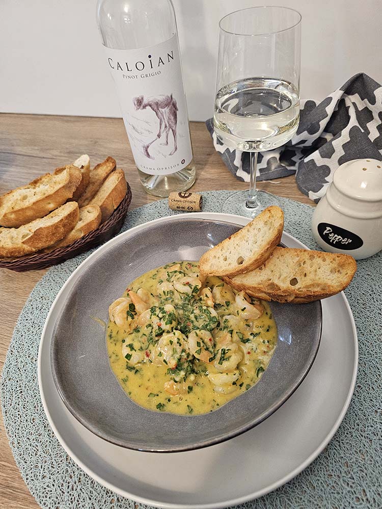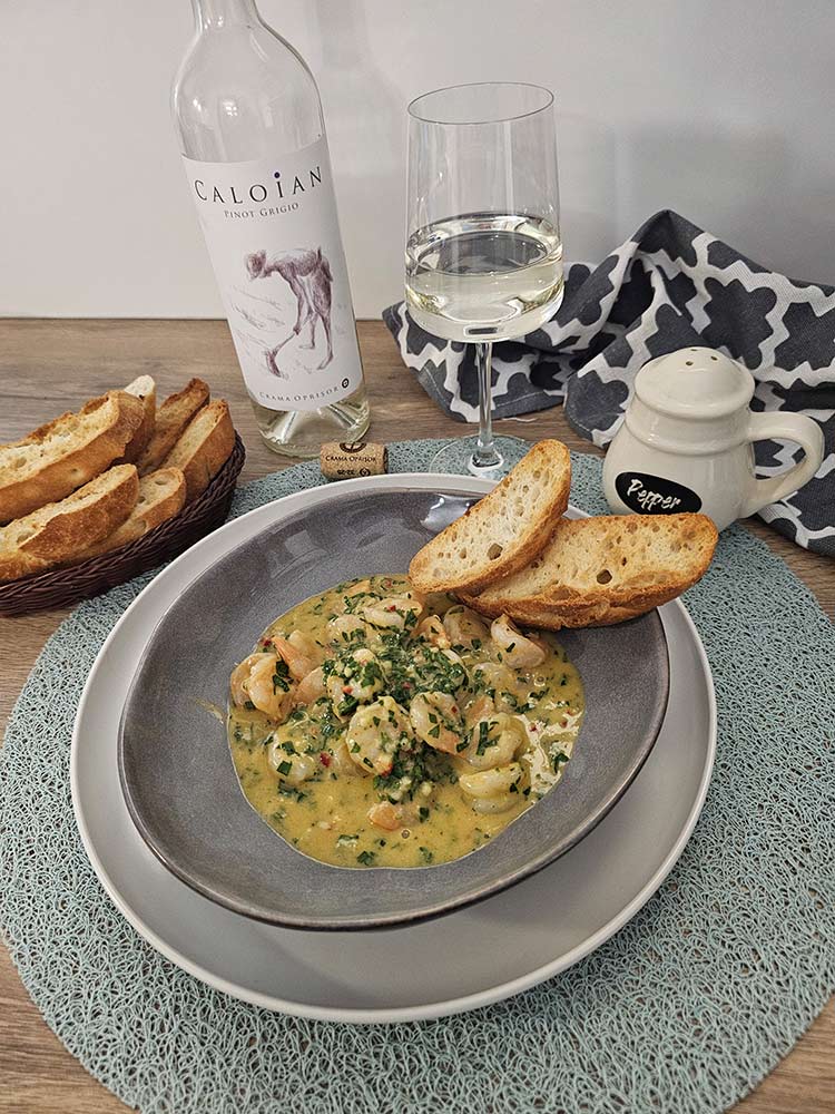 Acesti crevetii in sos de unt chimichurri merg perfect cu vinul Caloian Pinot Grigio de la Crama Oprisor. Aciditatea ridicata a vinului taie grasimea untului, in timp ce aromele sale de citrice scot in evidenta dulceata naturala a crevetilor.