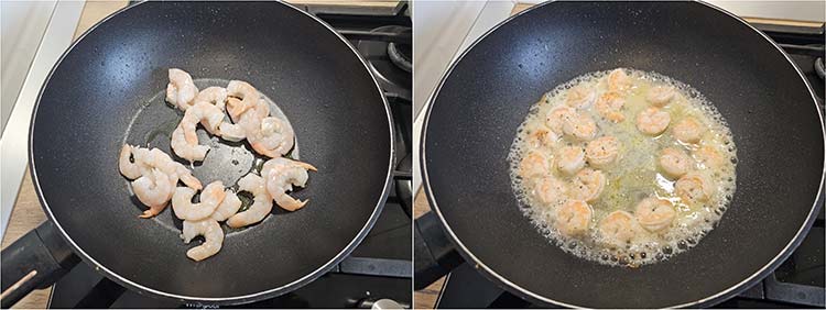 Crevetii curatati si stersi de apa cu prosoape de hartie se pun la prajit intr-o tigaie in doua 2 linguri ulei de masline. Se condimenteaza cu sare si piper si se prajesc cate 1-2 min pe fiecare parte. Se adauga zeama de lamaie si vinul si se lasa 2 min sa scada.