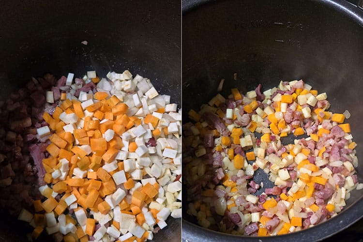 In uleiul ramas punem la calit baconul, morcovul, telina si ceapa si calim timp de 5 minute.