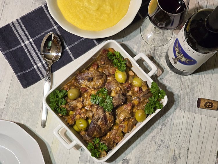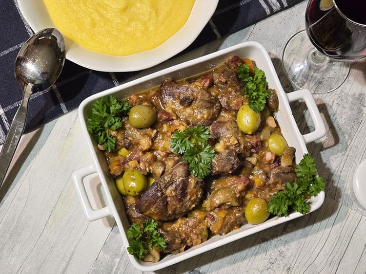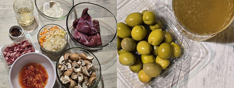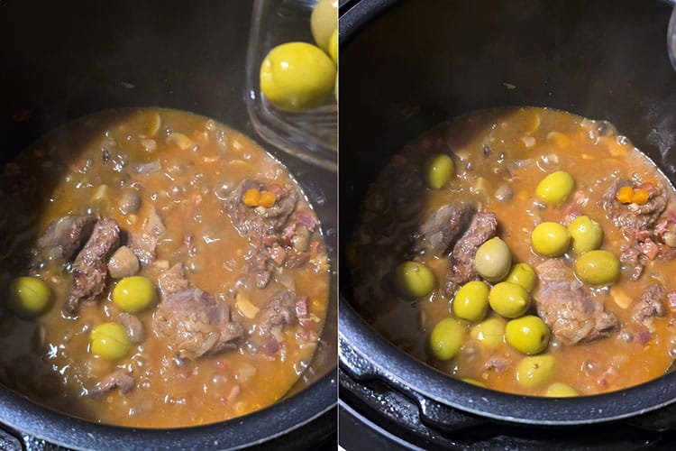 Cand carnea este fiarta adaugam ciupercile taiate si se lasa la fiert inca circa 10 minute. La final adaugam maslinele verzi circa 20 – 25 de bucati sau masline negre care va sunt pe plac si mai lasati sa dea doua, trei clocote.