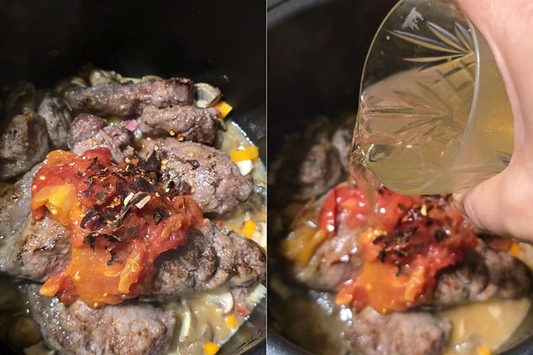 Adaugam usturoiul maruntit, carnea, rosiile taiate, vinul fulgii de ardei iute( optional), si supa ( apa).