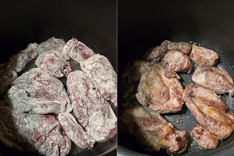 Condimentam carnea cu sare si piper. Dam bucatile de carne condimentata prin faina. Incingem uleiul intr-o tigaie si rumenim carnea. Bucatile de carne rumenite se scot deoparte.
