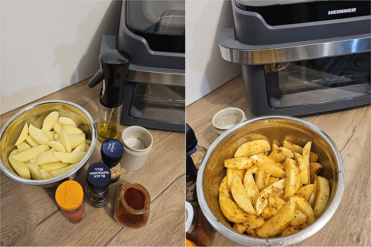 Se pun in cosul friteuzei in strat uniform, se selecteaza programul de cartofi cu un timp de 22 min si o temperatura de 200°C.