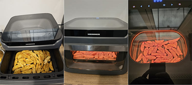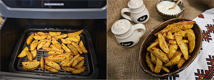La mijlocul timpului de coacere, friteuza atentioneaza prin semnal sonor ca trebuie intors sau scuturat preparatul, apoi se continua coacerea. Nu a mai fost nevoie de prelungirea timpului de coacere, cartofii iesind crocanti la exterior si moi la interior.