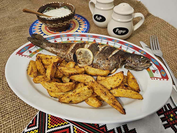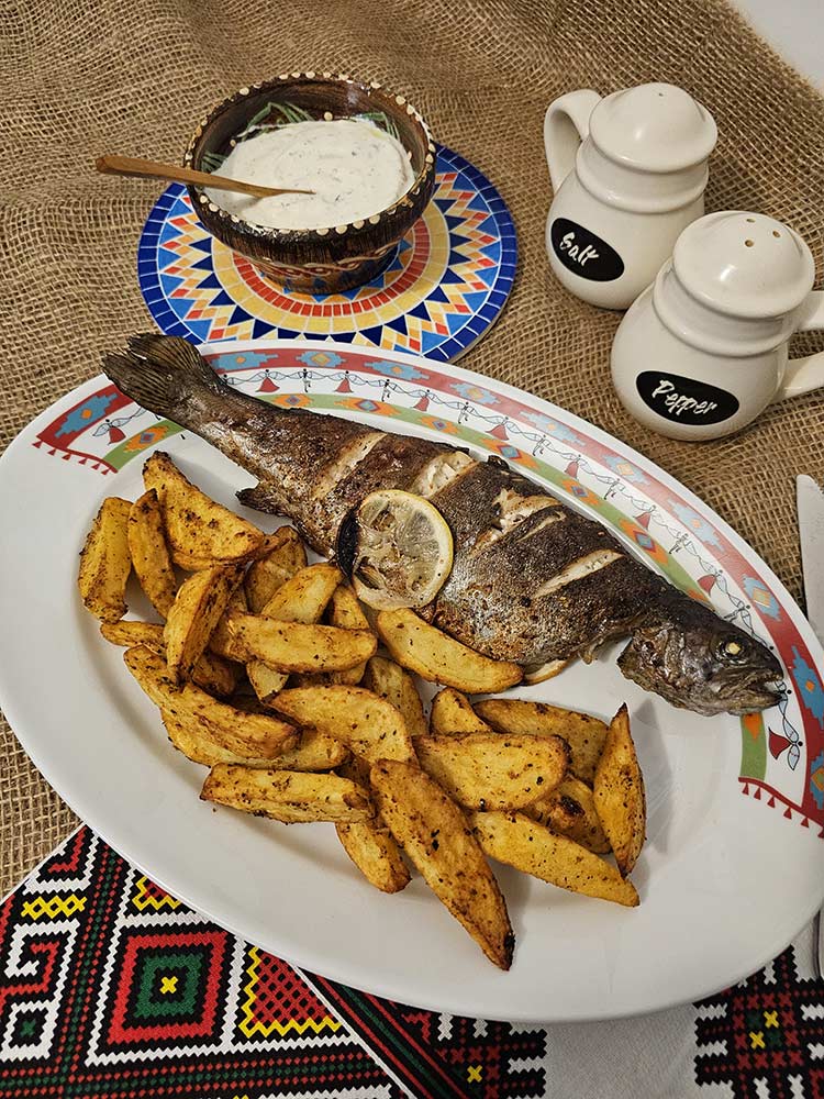 Pastravul gata prajit se scoate pe un platou, se aseaza alaturi cartofii wedges si sosul de iaurt si se mananca cu mare pofta!!