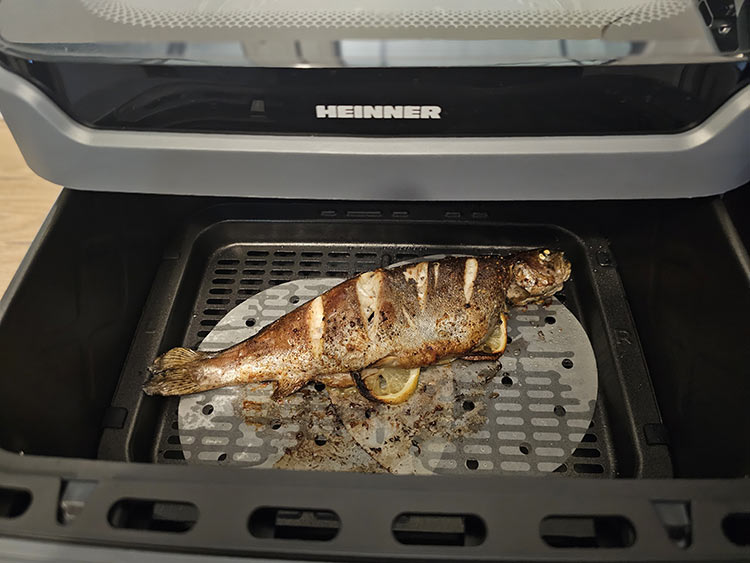 Se selecteaza functia de „Fish” cu o temperatura de 195°C si un timp de 20 min. La mijlocul timpului se intoarce pestele si se continua prajirea. Dupa cele 20 min. selectam functia grill pentru 7 min si se lasa sa se rumeneasca . Aceasta e optionala, eu am dorit sa o folosesc, puteti insa mari timpul de prima data la prima functie.
