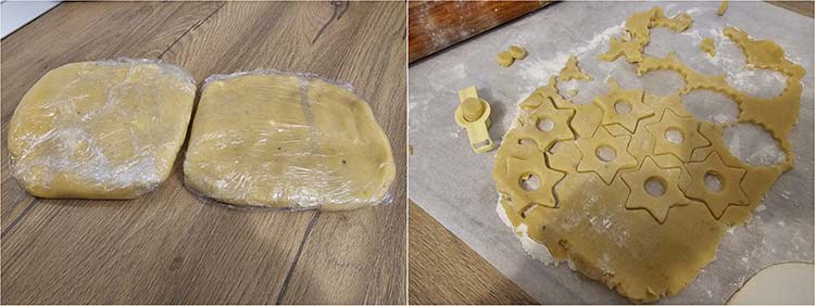 Se scoate din folie, se pudreaza blatul cu faina si se intinde aluatul intr-o foaie cam de 4 mm. Se decupeaza cu formele alese, avand grija ca fursecurile decupate sa fie perechi. Se aseaza pe tava, recomand ca sa NU se coaca in aceiasi tava fursecurile decupate cu bazele, deoarece timpul de coacere difera.