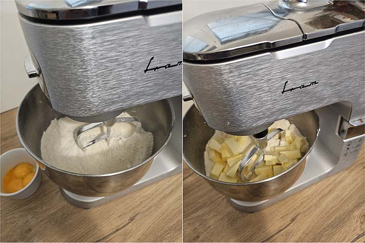 In bolul mixerului se pune faina, faina de migdale, zaharul pudra, zaharul vanilat, sare si coaja de lamaie, se ataseaza paleta si se mixaza putin cat sa se amestece ingredientele.