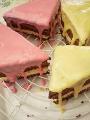 Dupa ce a stat la rece se scoate si se indeparteaza marginile pentru ca prajitura sa fie dreapta dupa care se taie in triunghiuri potrivit de mari (dupa nevoia fiecaruia). Fiecare triunghi se glaseaza in serbet pe care l-am incalzit pe baie de apa si se decoreaza dupa imaginatia fiecaruia. In cazul meu am facut cuibulete din crema in care am pus ousoare din fondant.