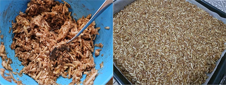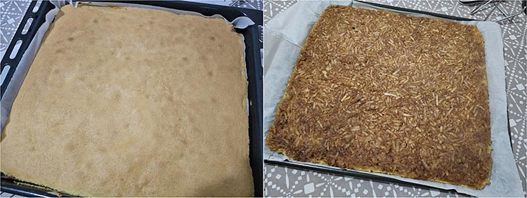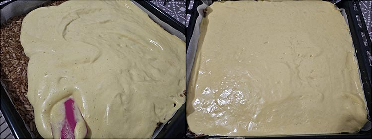 Compozitia se toarna deasupra merelor din tava si se intinde uniform cu o spatula.