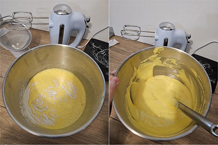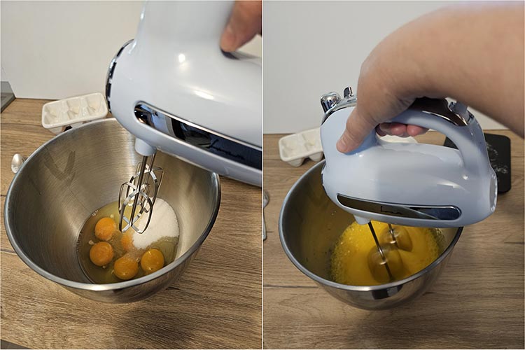 Ouale intregi se pun intr-un castron incapator, se adauga zaharul, zaharul vanilat, sarea si se mixeaza cu mixerul la viteza mare pana ce ouale cresc in volum si devin o spuma galben pai.
