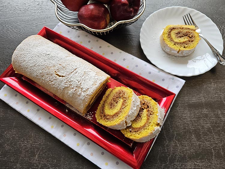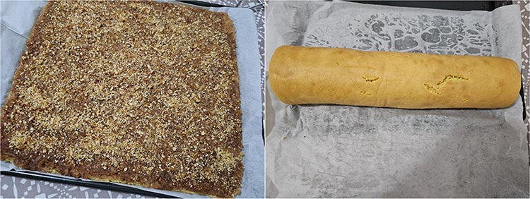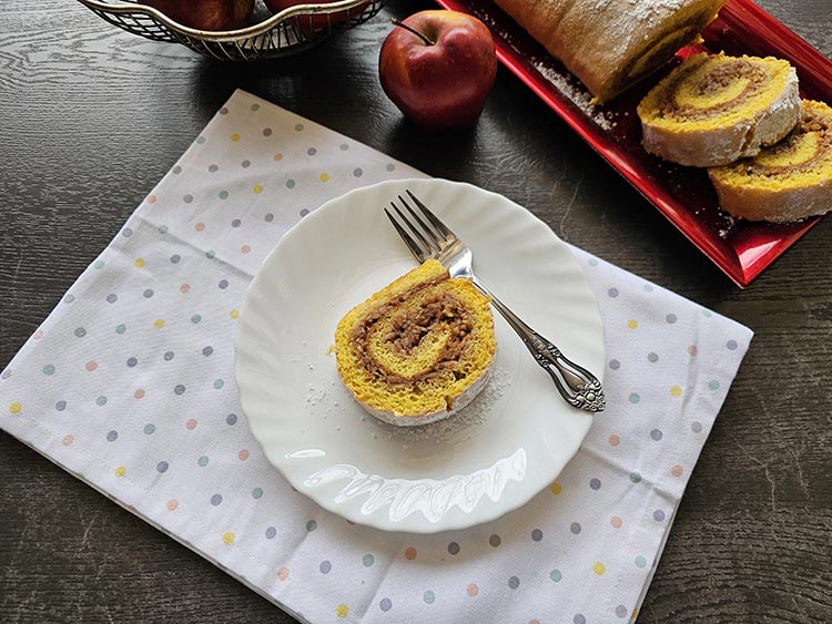 Se introduce in cuptorul preincalzit la 180C pentru 15-17 min sau pana ce foaia de rulada se coace, iar la atingere nu se lipeste de degete. Se scoate tava din cuptor, se presara cu putin zahar pudra, se aseaza peste ea o alta foaie de copt si o tava de aceiasi marime si cu o miscare rapida se intoarce foaia. Astfel deasupra ajunge stratul de mere, se lasa sa se racoreasca putin apoi se presara peste mere pralina de nuci (o puteti face si fara pralina).