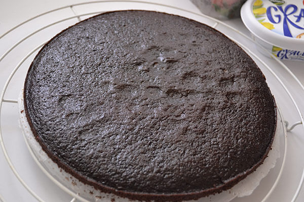 Tapetam cu hartie de copt baza unei forme de tort cu diametru de 24cm, impartim compozitia in trei si coacem pe rand cele trei foi de blat cate 20 de min pentru fiecare foaie in parte.
