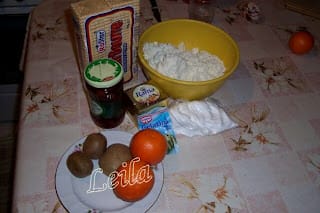 Portocalele se desfac , kiwi se taie felii. Intr-o forma rotunda tapetata cu folie de aluminiu punem un rand de biscuiti pe care se pune un strat de branza apoi iar biscuiti , iar branza si deasupra punem fructele . Peste fructe punem din nou un strat de branza si acoperim cu biscuiti. Dam totul la rece ptr . 2 ore ( eu am lasat la rece de pe o zi pe alta ).