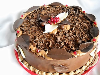 Decorul l-am realizat din ciocolata de menaj alba si neagra. Am topit ciocolata de menaj  pe baie de aburi, apoi am dat de circa 3 ori cu pensula pe dosul frunzelor de ficus (asta am avut la indemana … dar se pot folosi si alte tipuri de frunza , lasati dupa fiecare pensulare cu ciocolata sa raceasca stratul initial ) si cand a racit ciocolata bine am indepartat cu grija frunzulita. Si iata am obtinut frunzele de ciocolata . In scurt timp , colega mea de blog, Lory va reveni cu un filmulet in care ne va prezenta cum se fac aceste frunzulite . Am folosit seminte de rodie la decor si crema ganache . Braul de ciocolata l-am facut intanzand un strat de ciocolata mai grosut pe hartie de copt (am masurat initial latimea de care am nevoie ) apoi inainte sa se intareasca complet l-am pus pe tort si l-am lasat acolo pana a racit complet. In acest moment am indepartat hartia si braul a ramas pe tortulet.