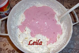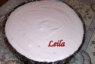 Cele 2 plicuri de gelatina se pun la inmuiat in 100 ml apa. Batem frisca, adaugam intaritorul, adaugam si iaurtul de capsuni si in cele din urma adaugam si gelatina incalzita pana se dizolva. Se amesteca pana se omogenizeaza totul si se toarna peste prima crema din forma. Se da iar forma pentru 10-15 minute la congelator pana se intareste si intre timp preparam Ornamentul .